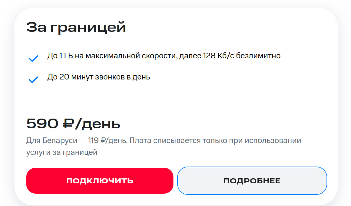 В «Билайне» предлагают одинаковые условия практически для всех стран мира. Пакет состоит из мобильного интернета, в него входит 1 ГБ на максимальной скорости, и стоит все это 500 рублей. Нужно отметить, что максимальная скорость в данном случае определяется сетью, к которой вы подключаетесь в роуминге, и ее характеристиками. Наверняка в странах, куда вы приедете, будет 5G, но вы получите 4G, хотя это не играет большой роли, в поездках с ограничением трафика нет смысла качать что-то тяжелое через мобильный интернет. Он нужен, чтобы пообщаться в мессенджерах, посмотреть почту, возможно, сделать видеозвонок (учитывая блокировки в России, это та еще задачка со звездочкой). Поэтому разницы между 4G/5G для поездки с российской SIM-картой нет, сценарии использования и ограничения трафика таковы, что можно смело их игнорировать.