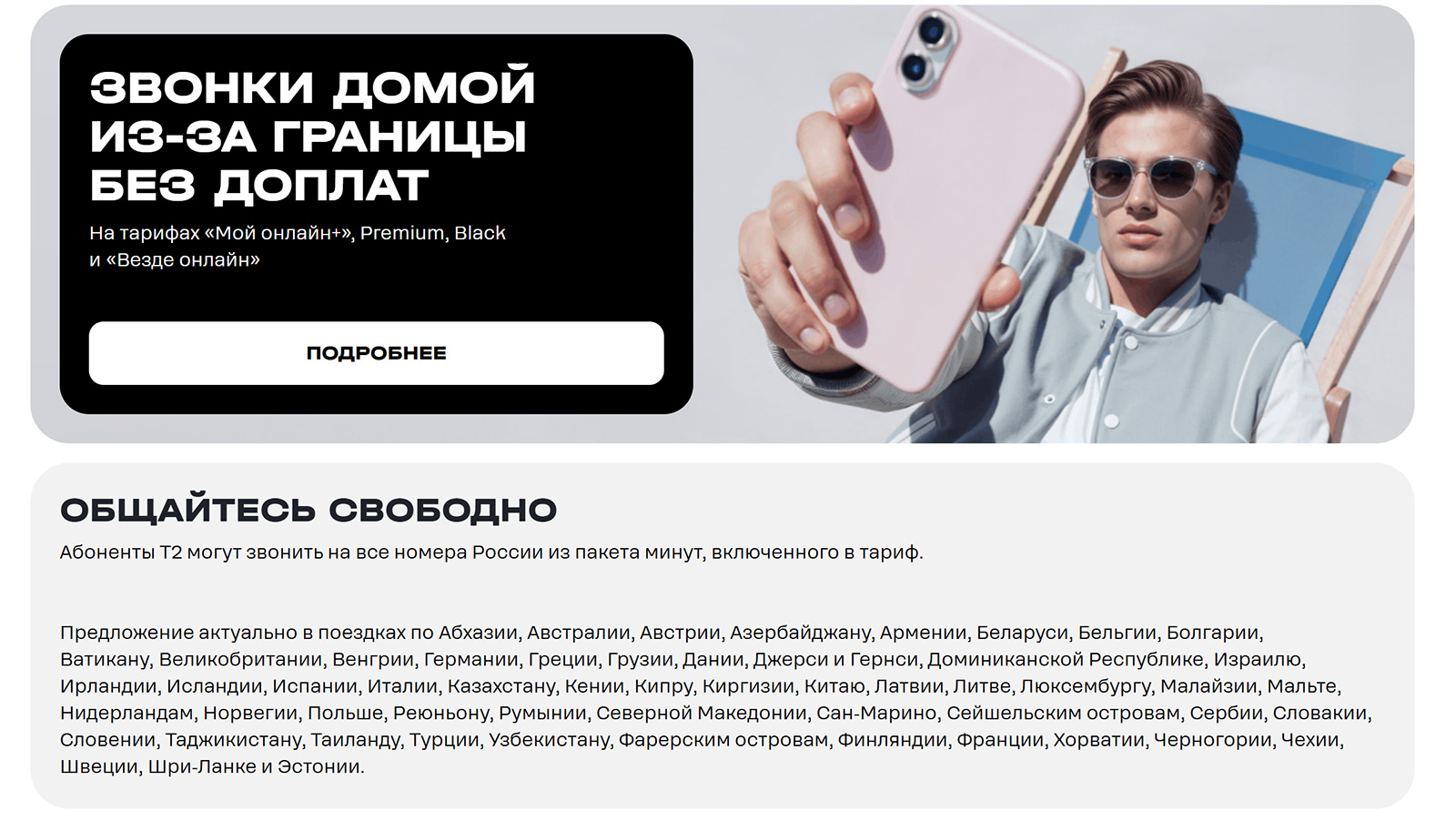 В тарифе Black число бесплатных дней значительно меньше, но они также присутствуют. И это шикарная опция для тех, кто часто ездит. У меня получается, что в месяц примерно половину времени могу быть вне России, и на моем тарифе Premium каждый день использования сети бесплатен. Никакой надобности в подключении местных SIM-карт просто нет. Пользуюсь своим телефоном для общения, и этого хватает за глаза, без каких-то опций, включения и тому подобных вещей. Даже не выключаю роуминг данных для SIM-карты от Т2. Добавим сюда автоматически включаемые 7 рублей за входящий звонок, и получается шикарно. Сделал переадресацию на этот номер с других (переадресация может стоить каких-то денег, это стоит уточнить у оператора, с которого вы ее делаете). И бесплатные исходящие на российские номера (не только те что в России, ваш собеседник может быть в любой точке мира, главное чтобы у него был российский номер). Теперь не пытаюсь даже звонить через мессенджеры, у меня вся связь идет через обычные звонки. И это невероятно удобно, даже если вам нужно позвонить на горячую линию компании и провисеть полчаса, слушая музыку, вам это обойдется только в потерянное время, но не будет стоить ничего. Доступна такая опция на тарифах «Мой онлайн+», Premium. Black, «Везде онлайн», а также партнерских тарифов Tecno и «Я онлайн».