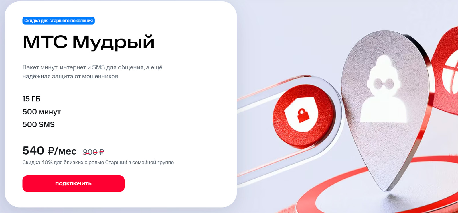 Другой нюанс в том, что МТС на плитке с описанием тарифа пишет про надежную защиту от мошенников. Нюанс в том, что защита от мошенников — это опция «Защитник+», которая является часть предложения «Семейная группа». А если кто-то просто подключит себе тариф «Мудрый», то будет платить 900 рублей в месяц и защиты от мошенников у него не будет.
