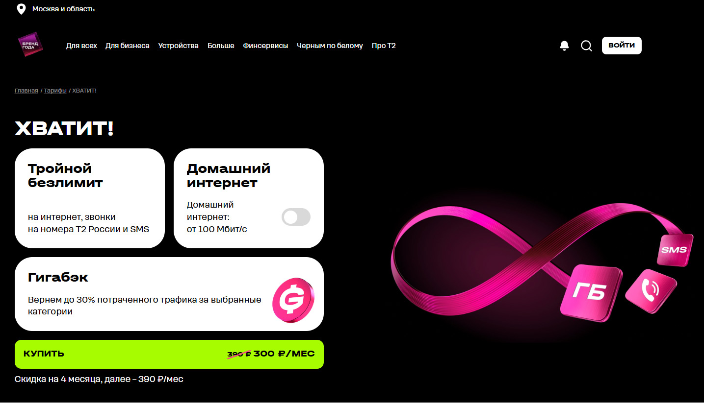 Итак, за 390 рублей в месяц Т2 предлагает: