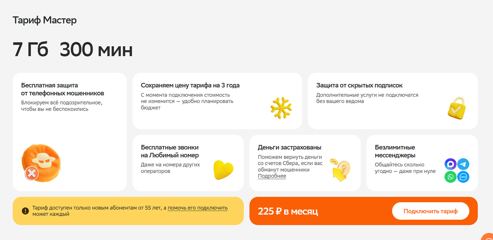 На странице тарифа оператор подсвечивает, что стоимость тарифа заморожена на 3 года. Там же рассказывается, как надо правильно вести разговор с мошенниками. У «СберМобайл» есть защита «Хранитель», которая слушает разговоры и способна распознавать мошенников по типичным оборотам и фразам. Если система поймет, что абонент разговаривает с жуликом, то она предупредит. При этом мошенник ничего не услышит.