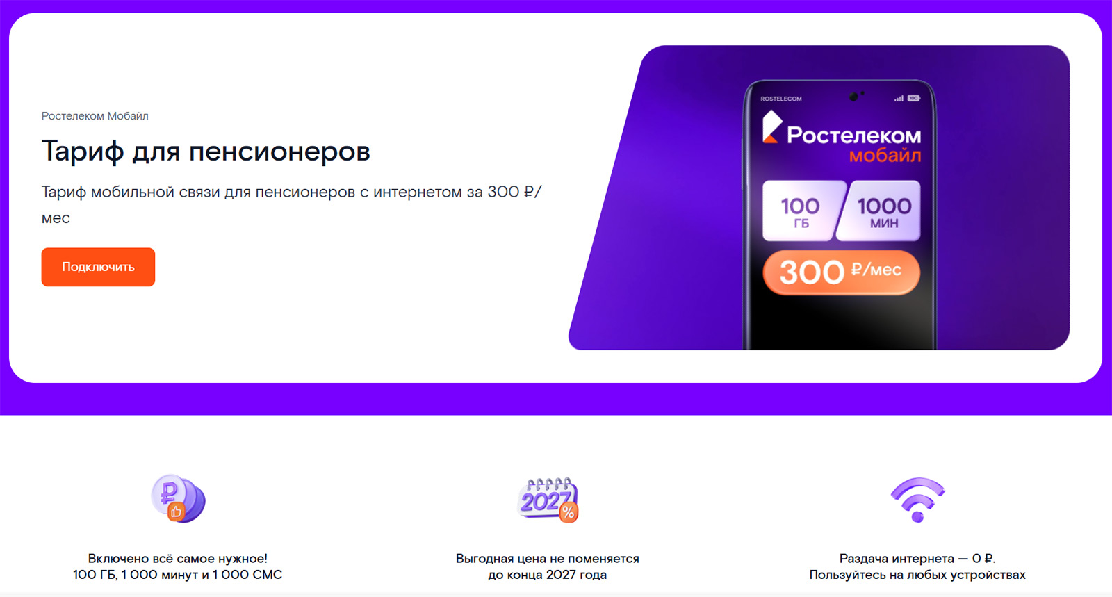 К слову, подобный тариф «Ростелеком Мобайл» предлагает не только пенсионерам, а всем подряд. Оператор просто сделал посадочные под разные запросы. В описании тарифа не указано, как подтверждается статус пенсионера.