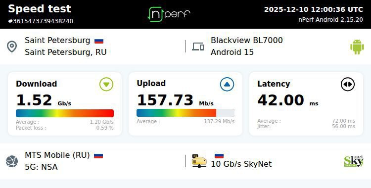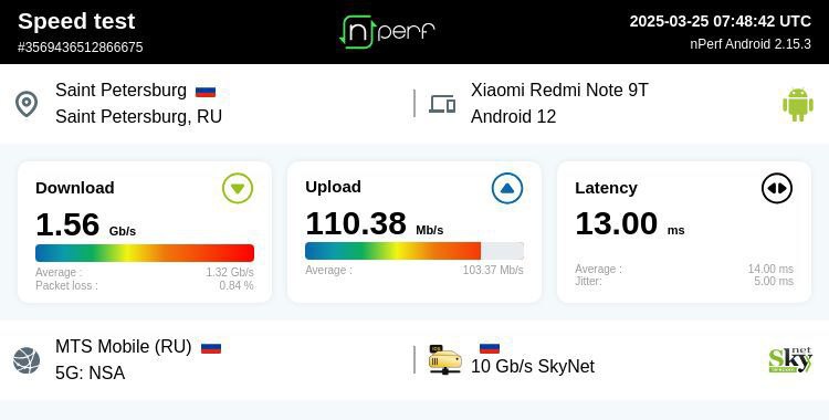 Говорить, что в России нет сетей пятого поколения, будет неверно, операторы создавали десятки опытных зон, многие из них продолжают работать, и вы можете воспользоваться ими. С одной оговоркой – если у вас смартфон с поддержкой 5G от китайского производителя. Ограничением становится отсутствие сертификации 5G для устройств. Такие компании, как Apple и Samsung, видят Россию как рынок без 5G, поэтому на уровне железа работа радиомодуля в таких сетях закрыта. Но у китайских производителей таких ограничений нет, телефоны к опытным зонам подключаются, выдают на-гора высокие скорости, причем зачастую этот трафик не учитывается в абонентской плате. В больших городах такие опытные зоны 5G есть в шаговой доступности от знаковых мест, ими можно воспользоваться. Например, вот скриншот скорости от нашего читателя из Питера.