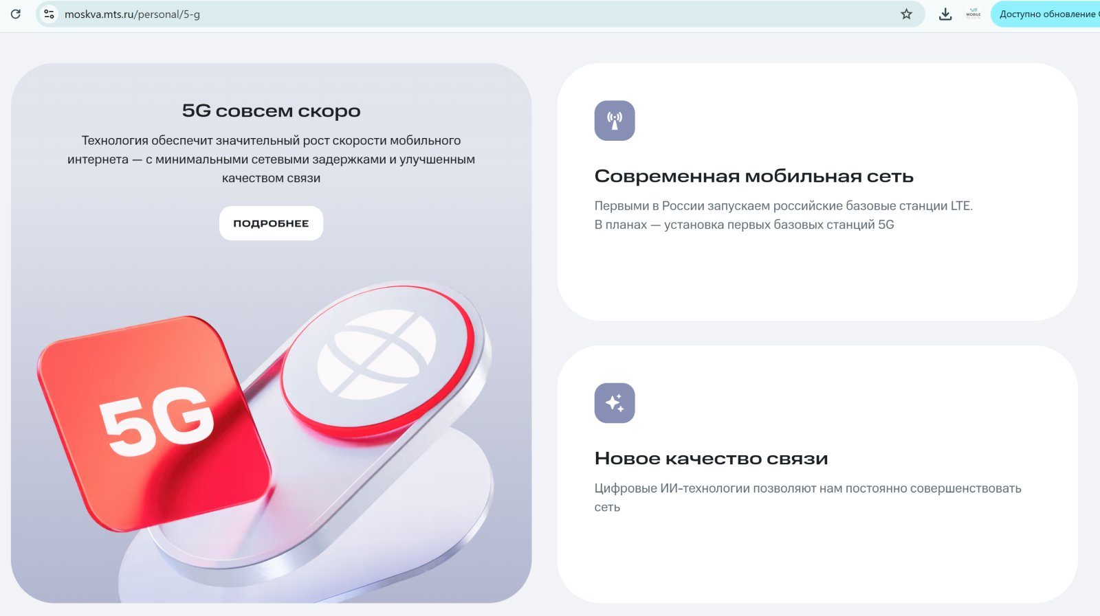 Не смотрю телевизор, но наши читатели завалили нас сообщениями о появлении рекламы 5G-сетей от МТС. Параллельно появилась страница на сайте компании, даже в заголовке есть 5G, хотя как таковой конкретики пока нет.