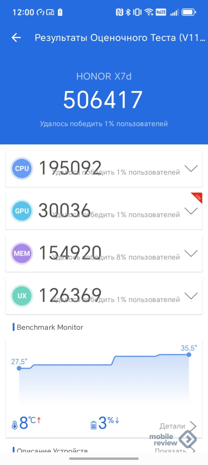 С другой стороны, HONOR X7d и не затачивался под игры, его потребители максимум, что делают, так это общаются в мессенджерах, листают социальные сети и смотрят видео. Вот для таких людей смартфон будет идеальным, так как здесь установлен крупный 6.77-дюймовый TFT LCD дисплей с разрешением 720 x 1610 точек и частотой обновления изображения 120 Гц. К тому же пиковая яркость экрана 800 нит, а стандартная — 700 нит, а это значит, что информацию будет хорошо видно даже на солнце, не говоря уже о помещении. При вроде бы довольно стандартных спецификациях, визуально картинка на дисплее смартфона выглядит приятно — цвета яркие, но при этом не вырви глаз, а углы обзора большие. Еще одной приятной особенностью экрана модели является возможность работать с ним, даже если у вас мокрые руки или на нем есть вода, например, во время дождя.