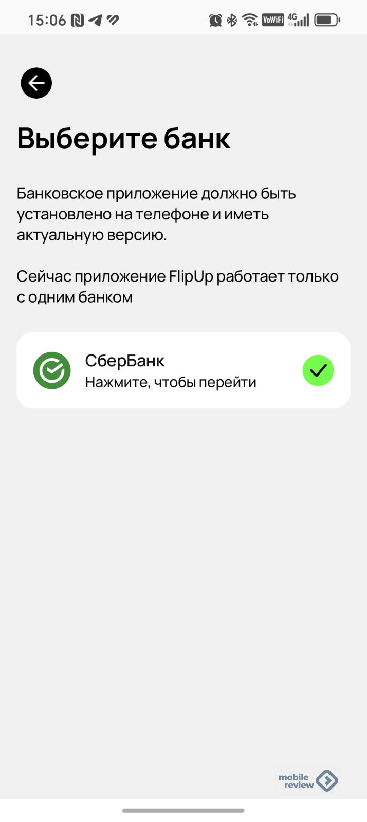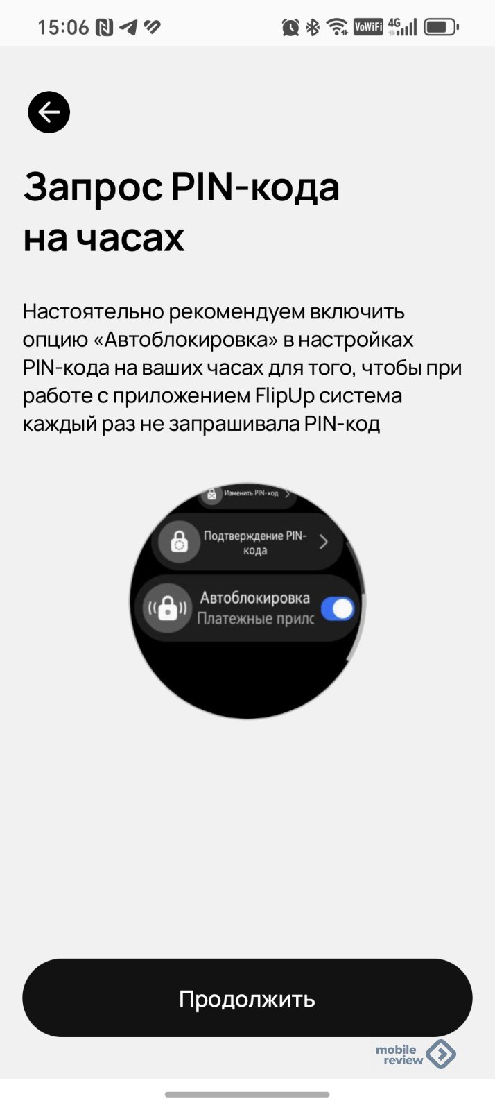 После запуска FlipUp на смартфоне система проверит установленные приложения, попросит дать необходимые разрешения, загрузить FlipUp на ваши часы, а также установить пин-код для доступа к нему с носимого устройства. Если все шаги прошли успешно, то вам останется выбрать банк, после чего будет запущено банковское приложение, где вам предложат выбрать карту и затем привязать её к часам.