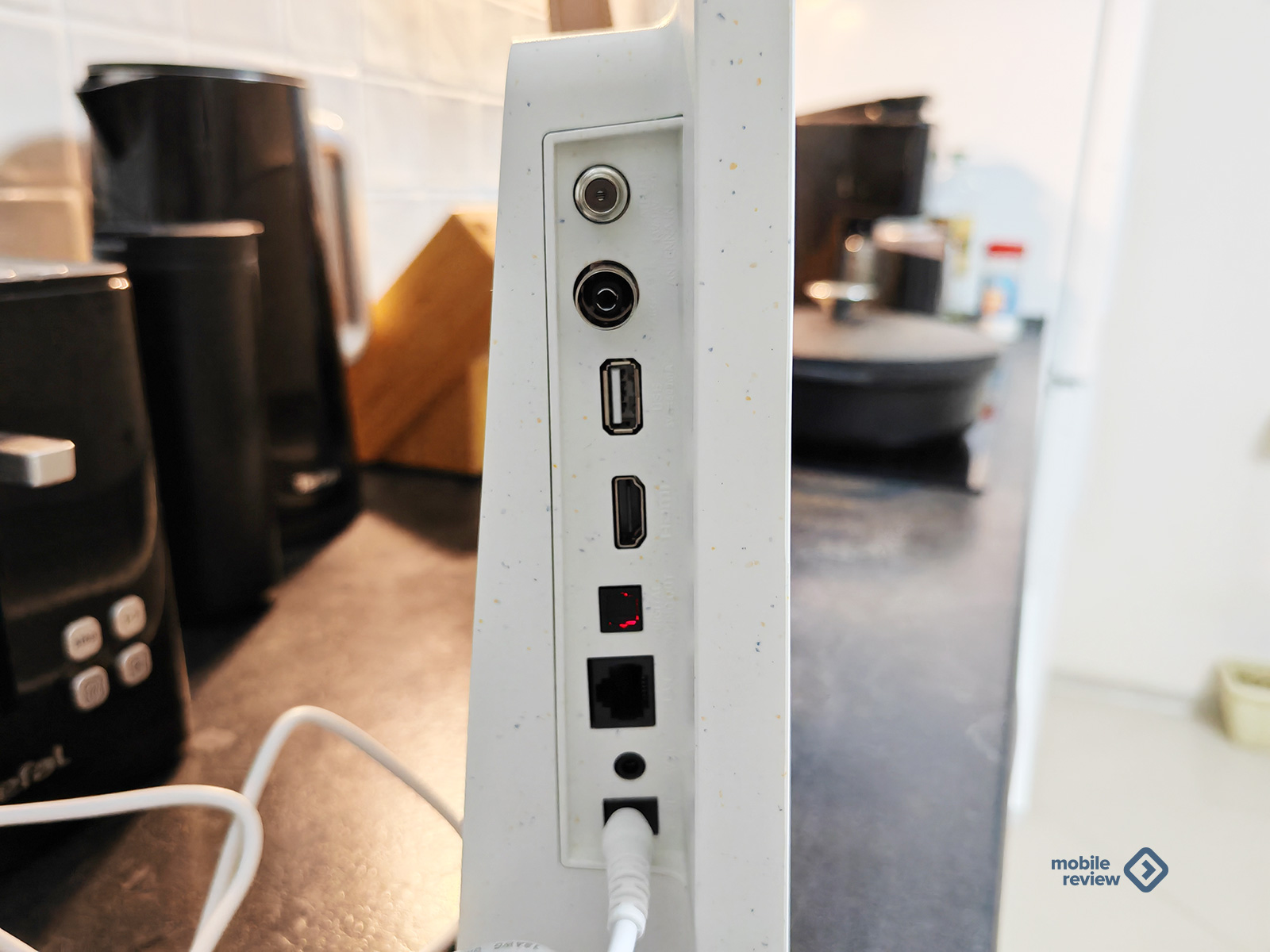 Телевизор Skyworth Portable TV получил стандартную компоновку разъемов, как и у большинства других моделей. Основные порты здесь спрятаны за экраном и располагаются на левой боковой грани моноблока. Там нашлось место для внешней и кабельной антенны, разъемов USB-A, HDMI 1.4, оптического разъема, LAN, аудиоразъема и собственного разъема питания. Сверху, на выступе моноблока, под резиновой заглушкой находится стандартный CI-слот.