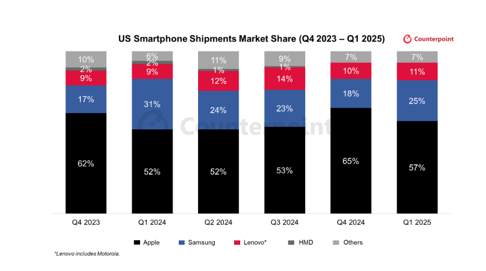 По оценке исследовательской компании Counterpoint, американский рынок смартфонов вырос на 9% в первом квартале текущего года. Отмечается, что большой импульс рынку придали новости о введении пошлин на ввоз товаров из стран Азии и Китая. Лидером американского рынка по итогам первого квартала стала компания Apple с долей 57%, результату Apple способствовали продажи модели iPhone 16e. Компания Samsung занимает второе место с долей 25%, при этом отмечается, что доля Samsung сократилась в сравнении с прошлым годом, когда она составляла 31%. Третье место у компании Motorola с долей 11%. Подчеркивается, что в сравнении с предыдущим кварталом доли Samsung и Motorola выросли, так, в четвёртом квартале Samsung получила только 18% рынка, а у компании Motorola было 10% рынка. В то же время доля Apple в праздничный сезон была по традиции более высокой и достигала 65%. На текущие результаты продаж на американском рынке накладывают значительное влияние факторы неопределенности в отношении пошлин на ввоз товаров из стран Азии и Китая и угроза администрации США наложить 25% пошлины на ввоз iPhone, если компания не перенесёт их производство в США.