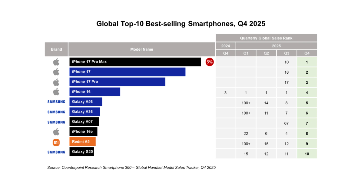 Единственным представителем другого бренда в топ-10 стала компания Xiaomi с моделью Redmi A5, занявшая девятое место. Основной объем продаж этого устройства пришелся на развивающиеся рынки стран Латинской Америки, Ближнего Востока и Африки. В целом, отчет показывает, что потребители все чаще выбирают либо флагманские решения от Apple, либо проверенные устройства среднего класса от Samsung.
