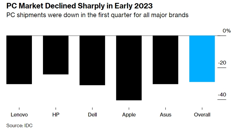 Еще одна категория продукции Apple — компьютерная техника — теряет любовь потребителей, впрочем, трудности испытывают и другие игроки рынка. Так, по данным информационного агентства Bloomberg (со ссылкой на отчет IDC), поставки всех производителей компьютеров в первом квартале 2023 года упали на 29% до 56,9 млн единиц, что ниже уровня начала 2019 года. Как и положено настоящим лидерам, первенство в падении принадлежит Apple — 40,5%. Затем идут Lenovo, Dell и Asus с падением более чем на 30%, на их фоне неплохо выглядит HP со снижением «всего» на 24,2%. Уточняется, что эксперты ожидают рост данного сегмента рынка только лишь в 2024 году.