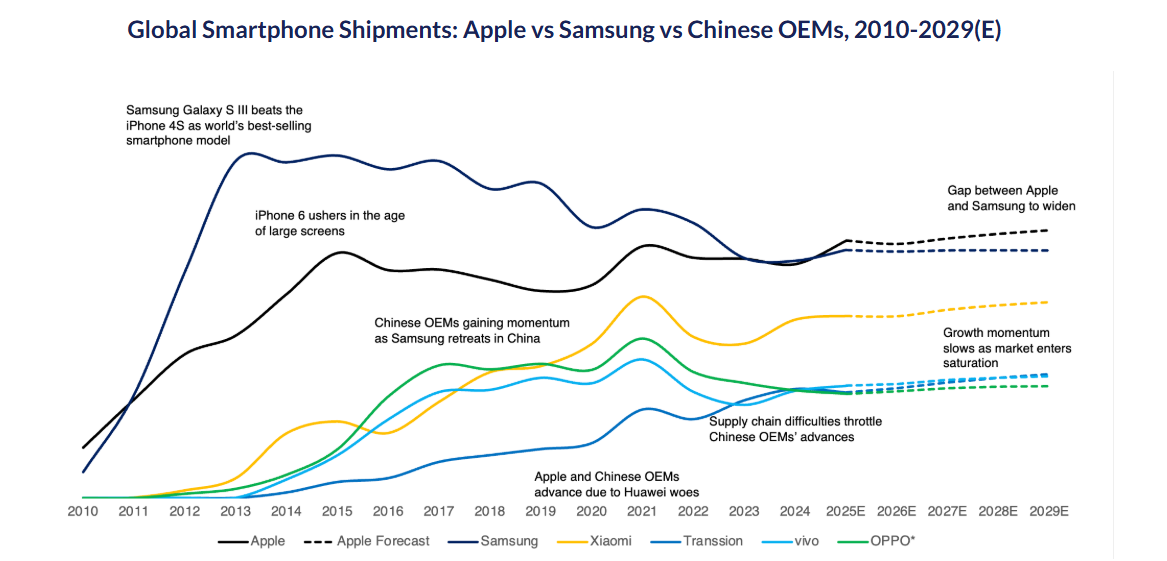 Согласно последнему прогнозу Counterpoint Research, в 2025 году мировые поставки смартфонов вырастут на 3,3% по сравнению с прошлым годом. Основным драйвером роста станет сильная динамика продаж Apple. ​Аналитики ожидают, что в 2025 году Apple впервые с 2011 года займёт первое место по объёму поставок смартфонов в мире, сместив Samsung, которая удерживала лидерство более десяти лет. Прогнозируется, что доля Apple достигнет 19,4% мирового рынка, в то время как доля Samsung составит 18,7% (при росте поставок на 4,6% в год). Apple, как ожидается, сохранит эту позицию до 2029 года.