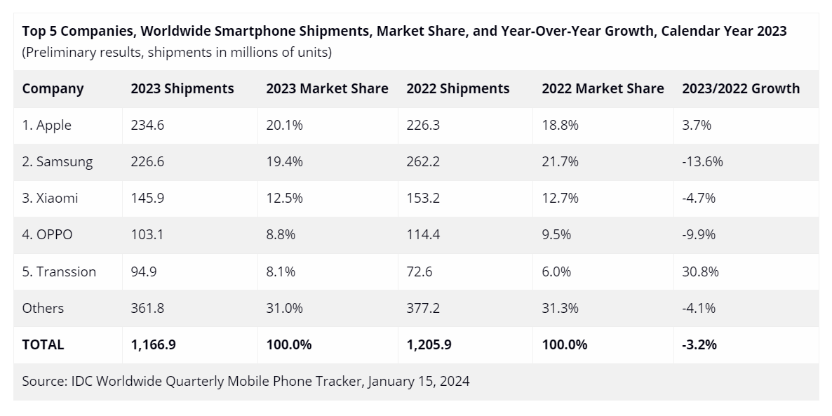 По данным исследовательской компании IDC, компании Apple впервые удалось опередить компанию Samsung и занять первое место по объёму продаж смартфонов за год. По итогам 2023 года объём продаж смартфонов Apple составил 234.6 млн устройств, при росте на 3.7%. По итогам года компания Apple обеспечила себе рекордную долю в размере 20.1%. Доля Samsung сократилась до 19.4%, всего Samsung продала 226.6 млн устройств, сокращение продаж по итогам года составило 13.6%. За последний квартал 2023 года Apple продала 80.5 млн смартфонов, увеличив продажи на 11.6%, что обеспечило ей долю в 24.7% по итогам четвертого квартала. Замыкает тройку лидеров по итогам года компания Xiaomi с результатом 145.9 млн смартфонов и долей 12.5%. Продажи Xiaomi также сократились за год на 4.7%, но в последнем квартале года компании удалось нарастить свои продажи на 22.7%, реализовав 40.7 млн устройств.