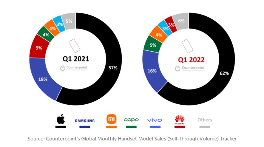 По данным исследовательской компании Counterpoint, в первом квартале текущего года компания Apple заняла 62% рынка премиальных моделей. Рынок премиальных смартфонов, к которым относятся модели стоимостью более 400$, показал снижение на 8% в годовом выражении в первом квартале текущего года, при этом остальной рынок снизился ещё больше. Отмечается, что в течение последних восьми кварталов премиальный сегмент опережает остальной рынок. Среди моделей на платформе Android безусловным лидером стал смартфон Samsung Galaxy S22 Ultra. Премиальный сегмент активно расширяется за счёт продаж гибких смартфонов. Объём продаж таких моделей вырос относительно результатов прошлого года на 184%, но пока его доля в общем объёме продаж невелика и составляет всего 3%.