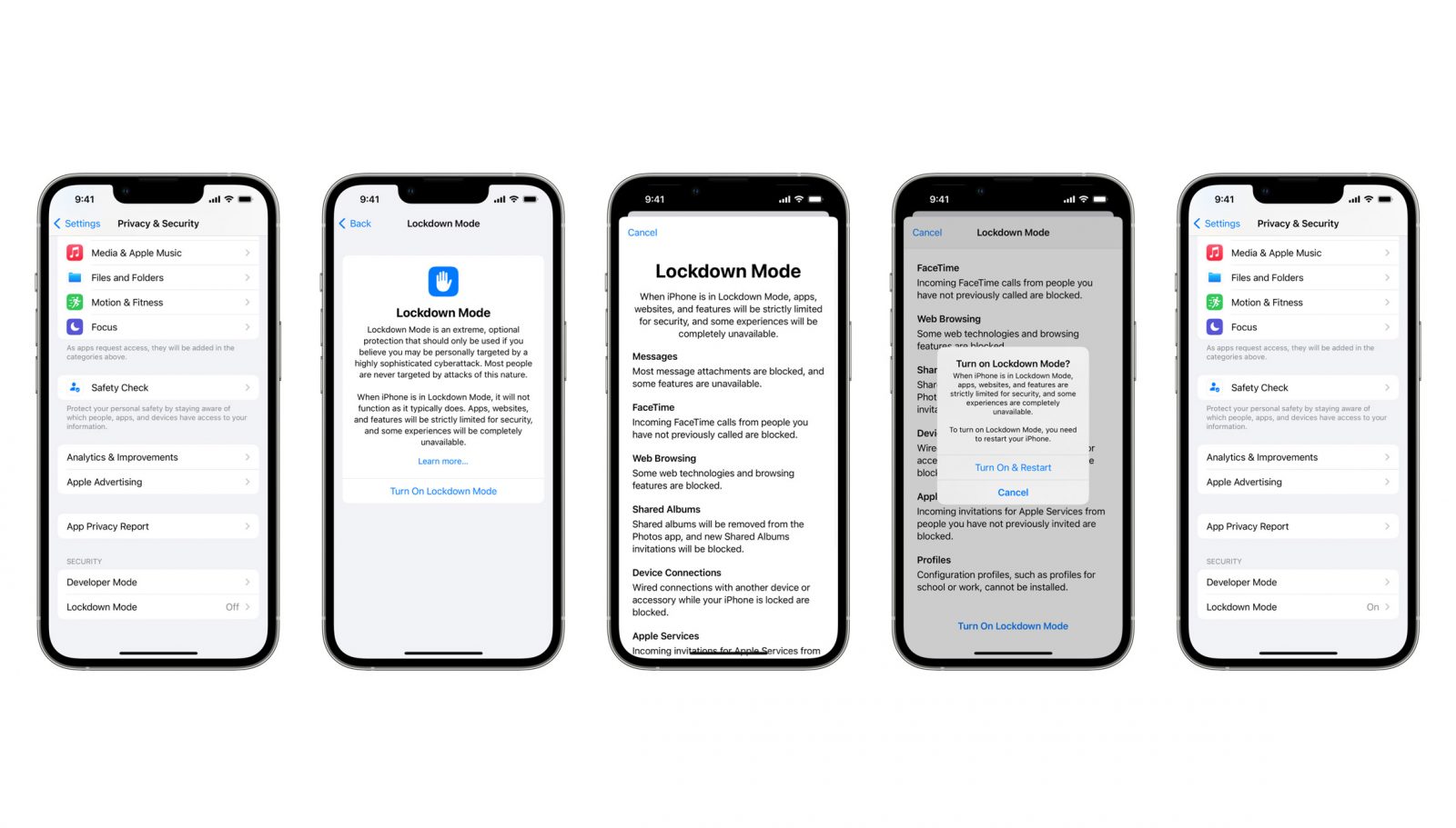Веб-браузер, еще один частый канал для хакеров, также будет строго ограничен, с ограничениями на определенные шрифты, веб-языки и функции, связанные с чтением PDF-файлов и предварительным просмотром контента. В FaceTime пользователи не смогут принимать звонки от человека, которому они ранее не звонили в течение предшествующих 30 дней. Режим блокировки можно включить с помощью переключателя в нижней части меню конфиденциальности в приложении настроек на устройствах Apple. Во время настройки пользователи будут предупреждены о том, что включение инструмента будет означать, что устройство «не будет работать так, как обычно» и что «приложения, веб-сайты и функции будут строго ограничены в целях безопасности, а некоторые функции будут полностью недоступны».