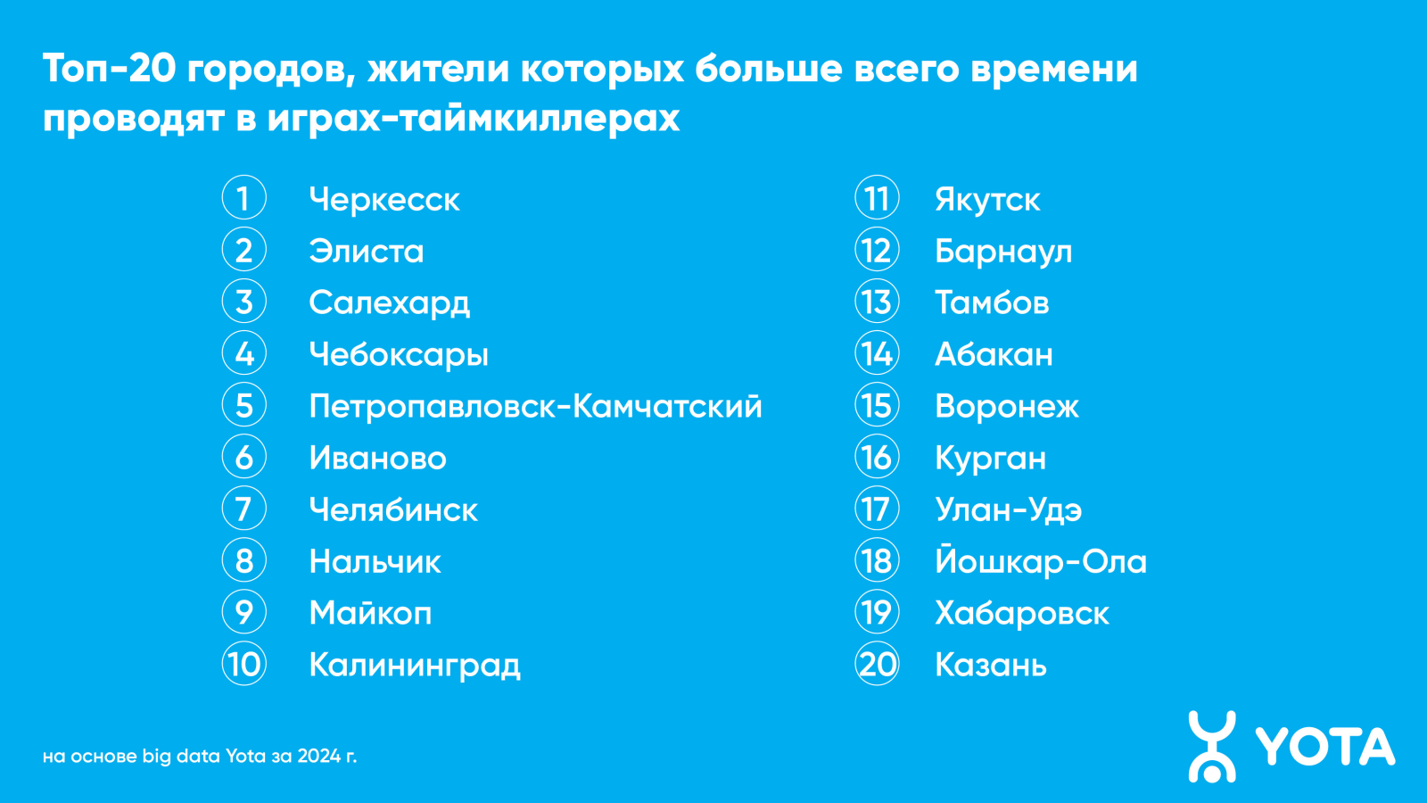 Мужчины и женщины в среднем одинаково активно играют в подобных приложениях. При этом пользователей-женщин чуть больше в различных «угадайках» (56%), стратегиях (54%) и играх с числами (53%), а мужчины превосходят числом в шахматах (66%) и викторинах (52%). Также от пола зависит, сколько времени абоненты проводят за играми: в среднем мужчины играют на 6% дольше, однако женщины тратят чуть больше времени в приложениях для шахмат и аркадах. Больше всего времени в играх проводят зумеры (14-20 лет), на втором месте — пользователи старше 56 лет, а на третьем — абоненты 36-45 лет. Интересно, что на шахматы наибольшее количество времени в месяц тратит именно молодежь (пользователи в возрасте 14-20 и 21-25 лет), а вот абоненты старше 56 лет оказались только на третьем месте. В среднем больше всего времени за играми проводят жители Черкесска, Элисты, Салехарда и Чебоксар. Дольше всего в шахматы играют в Салехарде, в угадайки — в Великом Новгороде, а в стратегии — в Черкесске.