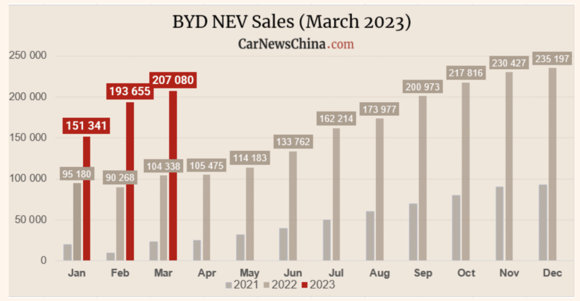 Компания BYD закончила первый квартал текущего года с ростом продаж на 90% относительно результатов прошлого года. Всего за первый квартал 2023 года компания продала 552 076 новых машин, а в марте было продано 207 080 машин, что оказалось на 7% выше продаж февраля. Таким образом, BYD удаётся сохранять высокие темпы роста продаж даже в условиях, когда национальные регуляторы начинают убирать стимулирующие программы для покупателей гибридных и электрических автомобилей. В первом квартале компанией было продано 264 647 новых электромобилей и 283 270 подключаемых гибридных машин, что соответственно на 87% и 90% больше, чем за такой же период в 2022 году. BYD также удалось продать 38 723 электромобиля на зарубежных рынках, что соответствует росту в 14 раз в сравнении с прошлым годом.