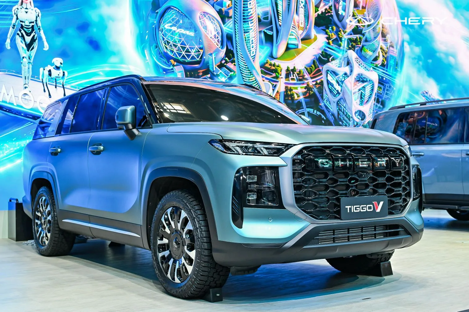 На Пекинском международном автосалоне компания Chery представила многофункциональный кроссовер Tiggo V, а также обнародовала глобальную стратегию развития до 2030 года. Tiggo V позиционируется как автомобиль-трансформер, сочетающий элементы трёх типов кузова — SUV, минивэна и пикапа. В зависимости от сценария использования автомобиль может менять конфигурацию салона и грузового пространства. В режиме SUV модель ориентирована как на дороги общего пользования, так и на бездорожье. Кузов на 76 процентов выполнен из высокопрочной стали и алюминия. В список систем активной безопасности входят предупреждение о фронтальном столкновении, автоматическое экстренное торможение, а также функции автоматической и дистанционной парковки. В режиме минивэна автомобиль предлагает трёхрядную компоновку салона с семью посадочными местами. Колёсная база составляет 2800 мм. Второй ряд сидений регулируется в продольном направлении в диапазоне до 380 мм, предусмотрена возможность трансформации в спальное место. В салоне расположены 42 ниши для хранения. Установлен двухзонный климат-контроль с отдельными воздуховодами для всех рядов и фильтром очистки воздуха уровня N95. Для грузовых задач и выездов на природу предусмотрен режим PUP. Задняя часть кузова оснащается съёмной перегородкой. Это позволяет перевозить крупногабаритные предметы и использовать аксессуары, включая палатки на крыше и автомобильные холодильники, без дополнительной модификации автомобиля.