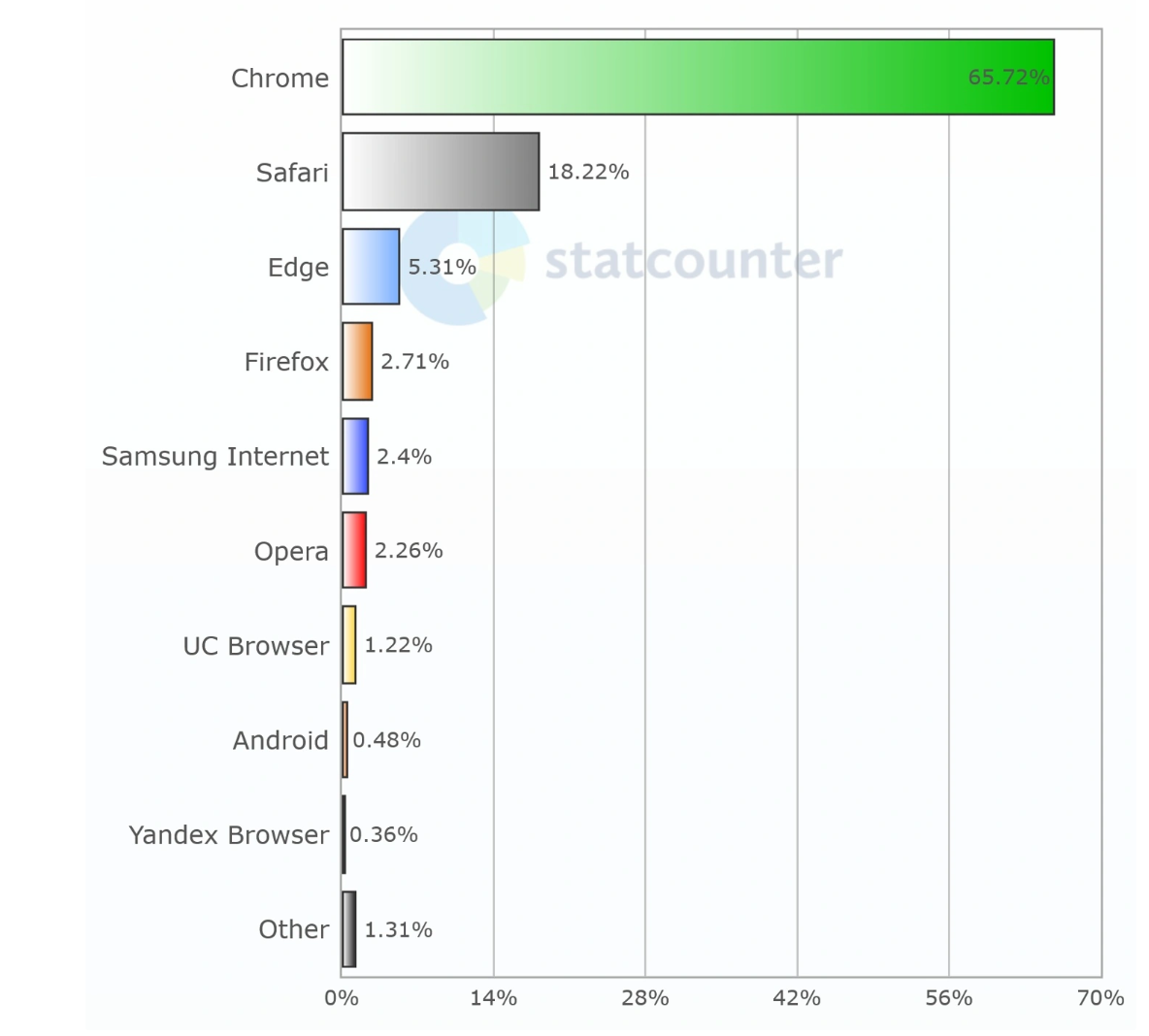 Анализ интернет-трафика, проведённый исследовательской компанией Statcounter по результатам сентября, показал, что браузер Chrome является абсолютным лидером рынка с долей 65.7%. Браузер компании Apple, Safari, занимает второе место с долей 18.2%, и замыкает первую тройку браузер Edge компании Microsoft с долей 5.3%. При этом, несмотря на самую значительную долю, браузеру Chrome удалось её и больше всех нарастить за прошедший месяц, увеличив долю на 0.52%. Для сравнения: браузер Safari увеличил долю на 0.35%, а браузер Edge — на 0.07%. Идущий на четвертом месте браузер Firefox имеет долю 2.71%, и она немного снизилась за прошедший месяц, сокращение составило 0.03%. Оставшуюся долю рынка делят браузеры Samsung, Opera и ряд других.