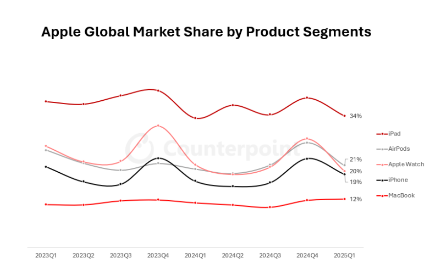 Исследовательская компания Counterpoint приводит данные по долям различных продуктов компании Apple в соответствующих сегментах товаров. Так, по итогам первого квартала текущего года планшеты iPad составляли 34% от общего объёма продаж планшетов на глобальном рынке. Наушники AirPods занимали 21% от общего объёма продаж наушников. На долю Apple Watch приходилось 20% рынка умных часов. Смартфоны iPhone занимали по итогам первого квартала 19% рынка. Компьютеры MacBook обеспечивали 12% продаж в своём сегменте. Эксперты отмечают, что во всех этих сегментах компания демонстрирует положительную динамику за исключением сегмента умных часов, продажи Apple Watch снижаются уже шестой квартал подряд. В то же время в сегменте планшетов, наоборот, результаты Apple демонстрируют значительный рост, чему способствовал выпуск модели iPad Air 7. В сегменте смартфонов хорошие результаты были поддержаны выпуском модели iPhone 16e, которая была с энтузиазмом принята на большинстве рынков.