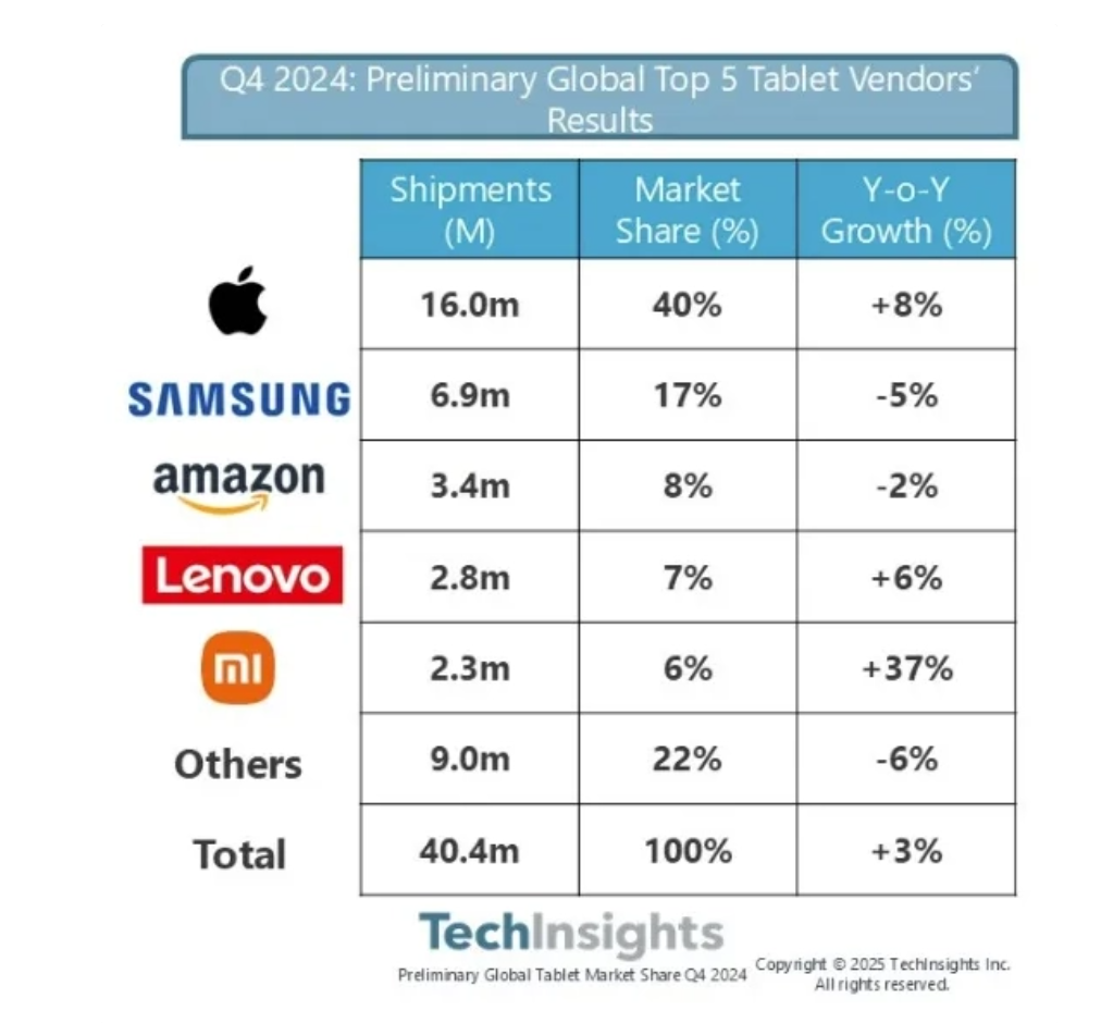 Согласно данным исследовательской компании TechInsights, в четвёртом квартале прошлого года глобальный рынок планшетов вырос на 3% в годовом сопоставлении несмотря на то, что в начале года демонстрировал рост на двузначные показатели. Компания Apple занимает лидирующие позиции на рынке планшетов с большим отрывом от остальных конкурентов, её доля достигает 40%. Идущая следом компания Samsung занимает долю в 17%. Продажи Apple в прошедшем квартале составили 16 млн устройств, а Samsung продала только 6.9 млн устройств. Третью строчку рейтинга исследователи отвели компании Amazon с продажами на уровне 3.4 млн планшетов. Таким образом, доля Amazon составляет 8% от глобальных продаж. В пятерке лидеров рынка также находятся компании Lenovo и Xiaomi с продажами в объёме 2.8 млн устройств и 2.3 млн устройств, что обеспечило им доли в 7% и 6% соответственно. Добиться значительных результатов компании Apple помог недавно выпущенный планшет iPad mini, спрос на который сдерживался долгим обновлением устройства. Также компания показала хорошие продажи бюджетной модели iPad 10-поколения.
