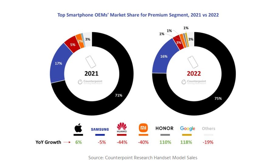 Несмотря на общее падение продаж смартфонов в прошлом году, рынок моделей стоимостью более 600$, наоборот, показал рост на 1%, за счет этого впервые в истории рынок дорогих смартфонов стоимостью выше 600$ обеспечил более 55% от общих доходов рынка. На него также пришлась одна пятая от всего объёма поставок в штучном выражении. Среди причин, которые позволили рынку премиальных моделей добиться таких результатов, называют меньшую чувствительность со стороны потребителей этого сегмента к глобальным экономическим проблемам. Кроме того, учитывая, что смартфоны являются важной составляющей жизни современного человека, все больше людей готовы тратить на них большие деньги, чтобы обеспечить их сохранность на высоком уровне в течение всего срока эксплуатации. Доля компании Apple в премиальном сегменте составляет 75%, следом идёт компания Samsung с долей 16%, у всех остальных игроков этого сегмента доли не превышают 1%.