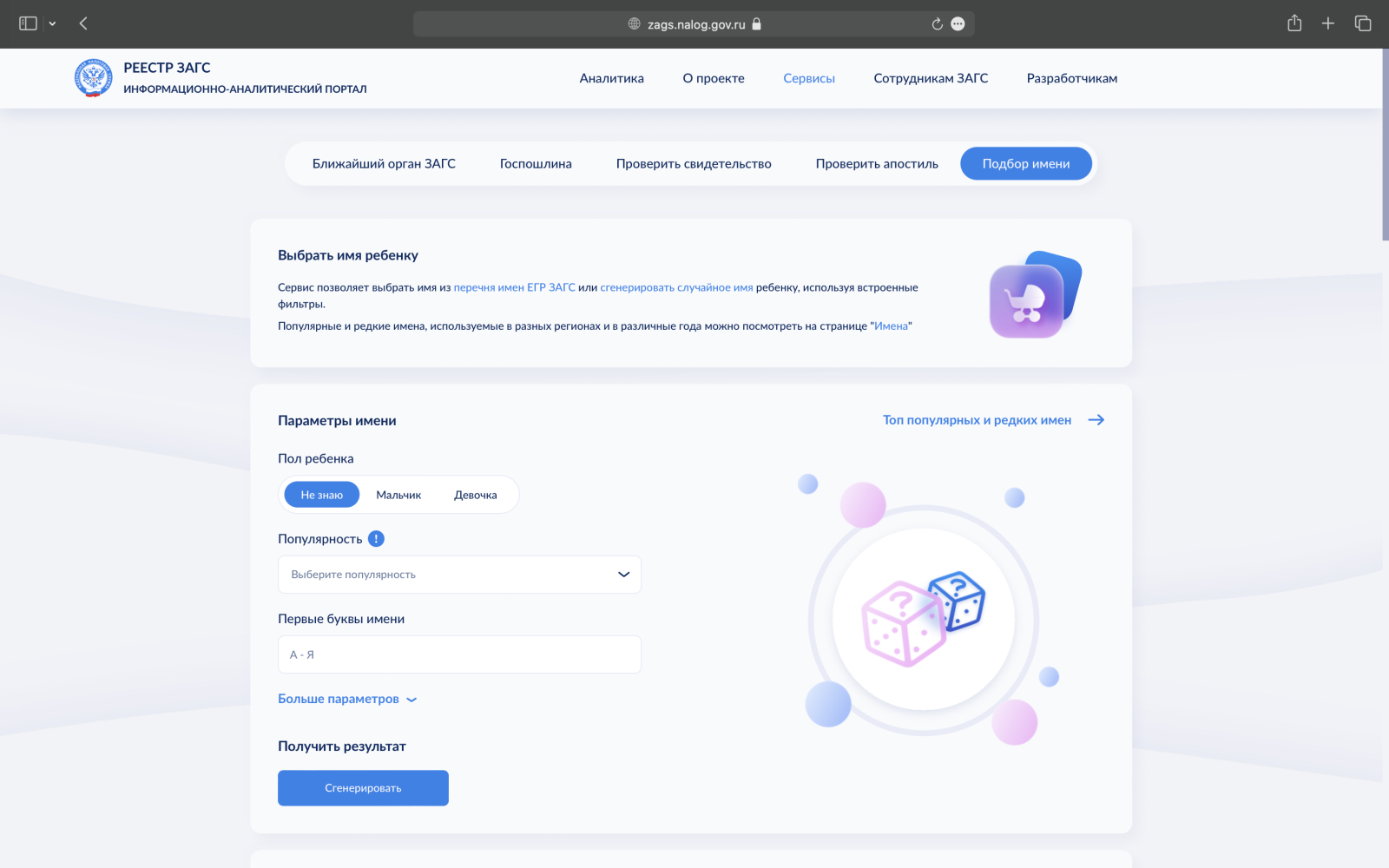 На портале ЕГР ЗАГС запущен новый интерактивный сервис, который поможет будущим родителям выбрать имя для ребенка, сообщает портал Федеральной налоговой службы России. Подбор сформирован на основании пяти тысяч реальных уникальных имен детей, рождение которых зарегистрировано в реестре ЗАГС с 1 октября 2018 года. Сервис позволяет родителям подобрать имя с учетом различных критериев: пола ребенка, наиболее часто встречающегося сочетания имени и отчества, пожеланий к популярности или редкости имени, его первым буквам или длине, с учетом региональных и национальных особенностей. Вариант можно сгенерировать и случайным образом, отмечают в ведомстве.