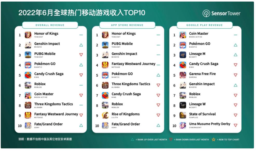 По данным исследовательской компании SensorTower, глобальные доходы от мобильного гейминга составили в июне $6.4 млрд. Эти доходы включают выручку от гейминга в магазинах приложений App Store и Google Play. Отмечается, что такой результат оказался на 10% ниже, чем в июне прошлого года. Рынок США обеспечил разработчикам 28.4% от всех доходов или $1.8 млрд. Следом идёт рынок Японии с долей 19.3%, и замыкает тройку лидеров игровой рынок Китая с долей 18.7%. В июне наибольшие доходы разработчикам принесли игры Honor of Kings и PUBG Mobile от компании Tencent и Genshin Impact от компании MiHoYo.Так, игра Honor of Kings заработала разработчикам $238 млн, а доходы Genshin Impact составили $154 млн. В пятёрку лидеров по доходам попали игры Pokémon GO от Niantic и Candy Crush Saga от King.