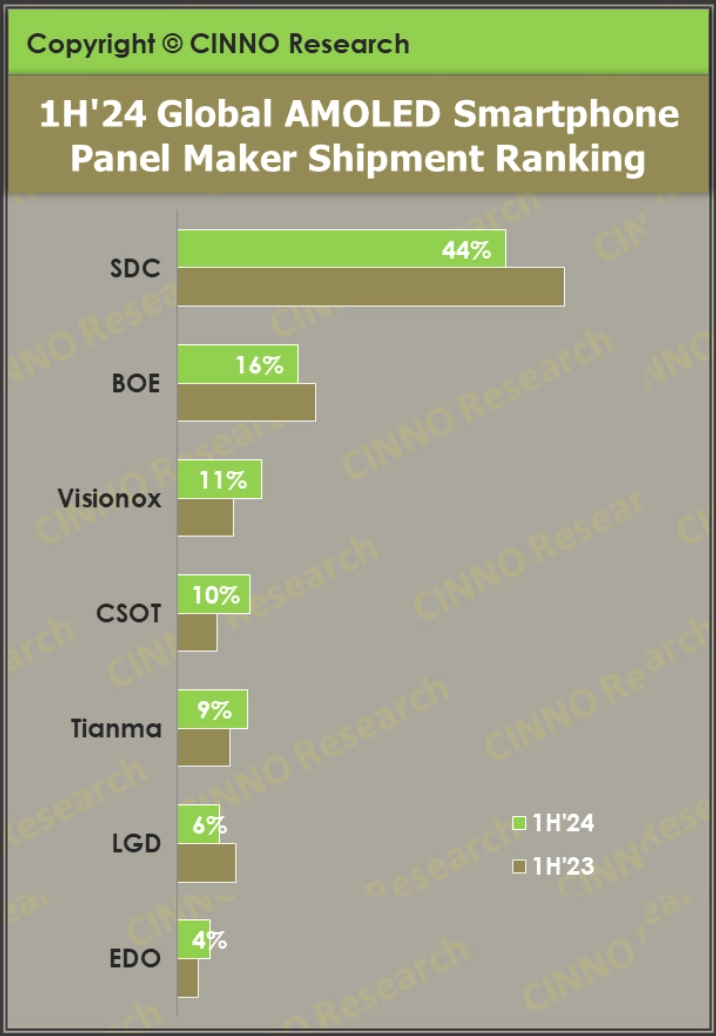 По данным исследовательской компании Cinno Research, глобальные поставки AMOLED-панелей для смартфонов в первой половине текущего года составили 420 млн единиц, на 55% превысив показатели отгрузок этого периода годом ранее. За второй квартал поставки панелей выросли на 50%. Отмечается, что спрос на AMOLED-панели продолжает оставаться на высоком уровне, чему способствует восстановление рынка смартфонов, а также постепенное проникновение AMOLED-экранов в смартфоны среднего и низкого ценового сегментов, что приводит к значительному росту общего количества продаж таких панелей. Доля производителей из Южной Кореи в этом сегменте рынка составляет 49,3%, на долю китайских производителей пришлось 50,7% от общего объёма продаж. Лидером рынка является Samsung Display с долей 43,8%, при этом, несмотря на снижение её доли с 51,6% в прошлом году, объём продаж панелей компании вырос на 27,3% по итогам первого полугодия.