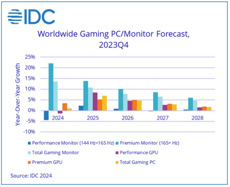 По прогнозам исследовательской компании IDC, глобальные поставки игровых персональных компьютеров постигла та же участь, что и весь рынок ПК в прошедшем году. Сегмент игровых ПК сократился на 13.2%, до уровня 44 млн устройств. Единственным сегментом в игровой индустрии, которому удалось переломить тенденцию, стали игровые мониторы, за счет снижения цен им удалось добиться роста на 20.3%. На этот год эксперты прогнозируют рост всего рынка игровых ПК на 1%. Такой скромный рост продаж будет обеспечен продажами игровых ноутбуков. Игровые мониторы также будут расти, за год их продажи увеличатся на 13.6%. По оценкам, рынок игровых ПК будет последовательно расти и достигнет уровня 52 млн устройств к 2028 году, а рынок игровых мониторов составит к этому сроку 29.6 млн устройств в год.