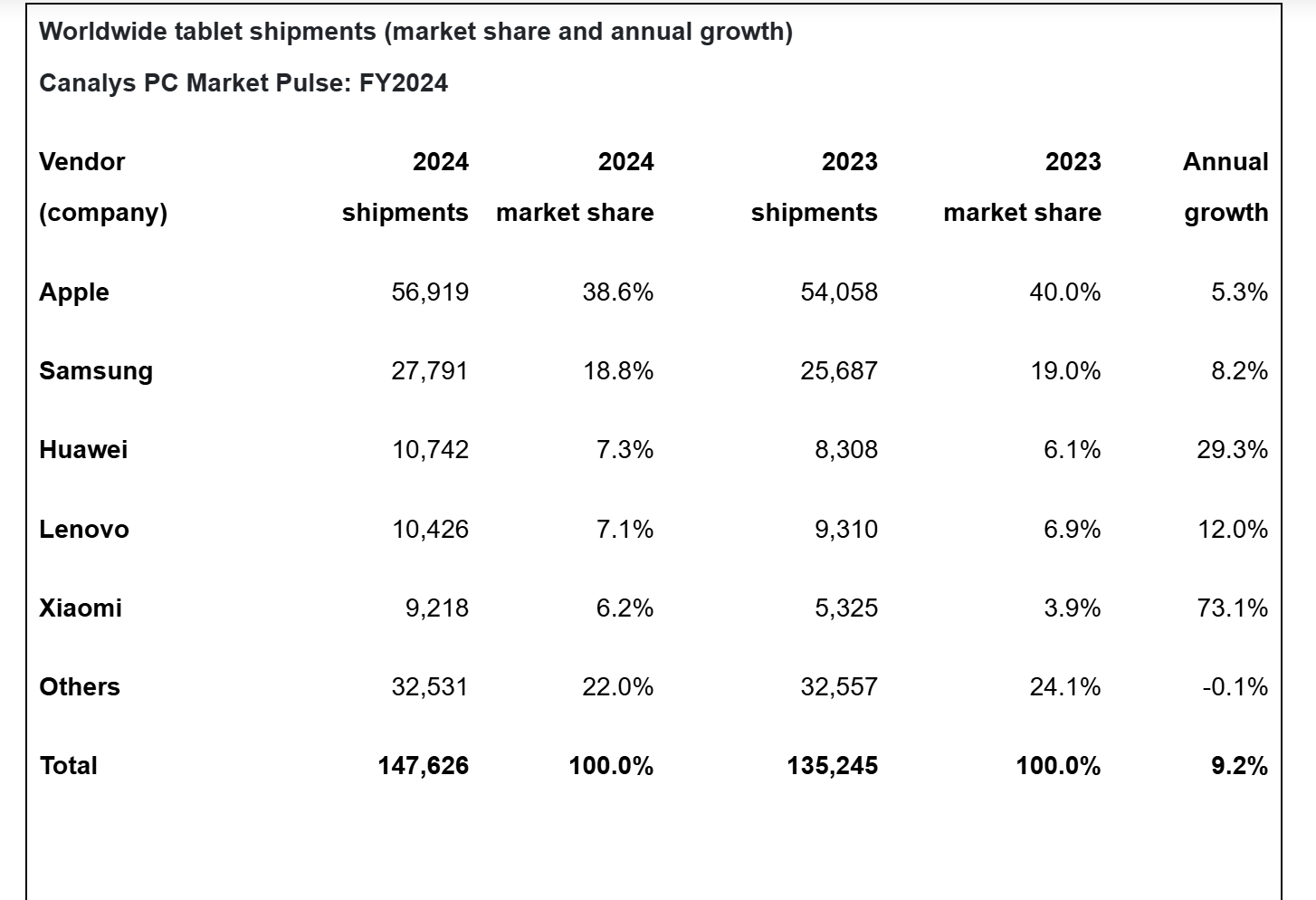 По оценке исследовательской компании Canalys, глобальные поставки планшетов в 2024 году выросли на 9,2% и достигли уровня 147,6 млн устройств. В четвёртом квартале на рынок было поставлено на 5,6% больше планшетов, чем в аналогичный период годом ранее. Объём продаж четвёртого квартала составил 39,9 млн единиц. Лидером рынка по объёму продаж за год стала компания Apple с продажами в объёме 56,9 млн устройств и долей 38,6%. Компания нарастила продажи на 5,3%. У компании Samsung объём продаж в прошлом году вырос на 8,2%, достигнув 27,8 млн устройств, что позволило ей занять долю в 18,8%.