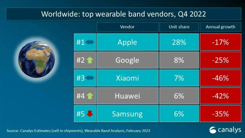 По оценке исследовательской компании Canalys, глобальные поставки умных носимых браслетов составили в четвёртом квартале прошлого года 50 млн единиц, что оказалось на 18.6% меньше результатов продаж в этот период годом ранее. Компании Apple удалось сохранить лидерство несмотря на спад продаж на 17%. На конец квартала её доля была 28%. Отмечается, что благодаря выпуску умных часов Google Pixel и результатам бренда Fitbit доля Google выросла до 8%, что обеспечило компании второе место на рынке. Компания Xiaomi заняла третью строчку с долей рынка 7%. Четвёртое и пятое места достались компаниям Huawei и Samsung с долями 6%. Снижение продаж коснулось всех лидирующих игроков, при этом наибольшее падение было у компании Xiaomi, на 46%, а менее всего снизились продажи у Apple, на 17%. Отдельно подчеркивается, что на рынке материкового Китая лидером этого сегмента является компания Huawei с долей 26%.