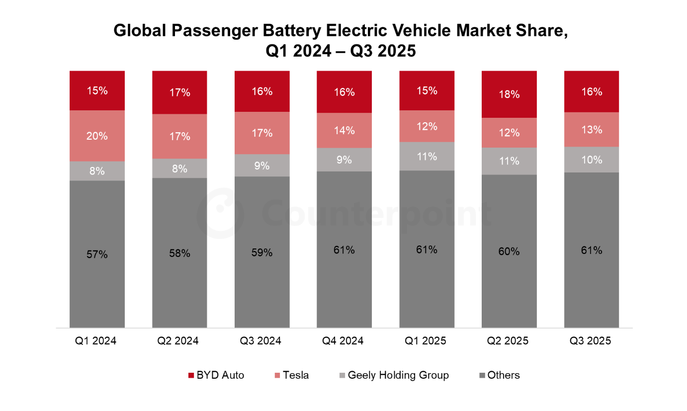 Tesla заняла второе место с долей более 13%. Продажи Tesla выросли на 7% в годовом исчислении. Рост обусловлен популярностью обновлённой Model Y и выпуском Model Y с удлинённой базой в Китае. Продажи в США также получили импульс благодаря тому, что потребители стремились воспользоваться последним раундом налоговых льгот на электромобили до их отмены в октябре 2025 года.