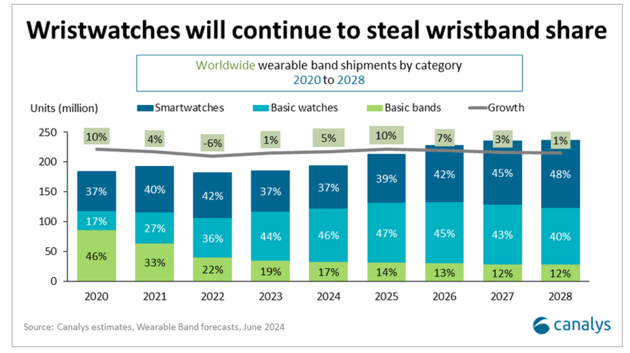 По данным исследовательской компании Canalys, глобальный рынок носимых браслетов вырастет в этом году на 5% и достигнет в общей сложности 194 млн устройств. Несмотря на снижение продаж в первом квартале на 0,2%, во второй половине года рынок укрепится и покажет прирост на 4%. Умные часы начального уровня вырастут на 10%, при этом продажи фитнес-браслетов, наоборот, сократятся на 6%. Отмечается, что во всем мире наблюдается рост популярности базовых умных часов начального уровня, их доля в общем объёме продаж носимых устройств достигла рекордного показателя в 48%. Многие производители, в том числе Samsung, Huawei, Zepp, активно используют новые программные сервисы, интегрируя в них функции искусственного интеллекта для предоставления более персонализированной и широкой информации о состоянии здоровья пользователя и его физическом состоянии. Такие решения находят отклик у покупателей и привлекают новых пользователей в сегмент умных часов.