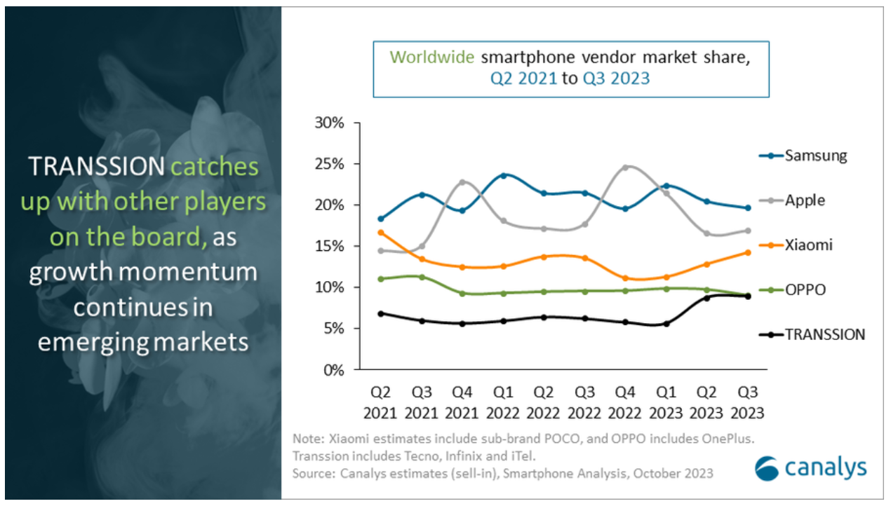 По данным исследовательской компании Canalys, глобальный рынок смартфонов постепенно восстанавливается, и за прошедший квартал он сократился всего на 1%. Canalys оценивает общий объём продаж смартфонов в мире на уровне 293.4 млн устройств. Лидером рынка в прошедшем квартале является компания Samsung, её продажи составили 57.4 млн устройств, что обеспечило Samsung долю в 20%. За ней расположилась компания Apple с отгрузками в объёме 50 млн смартфонов и долей 17%. У идущей на третьем месте компании Xiaomi отгрузки составили 41.5 млн устройств, а компания OPPO продала 26.4 млн устройств. Замыкает пятерку лидеров рынка компания Transsion, суммарный результат принадлежащих ей брендов Tecno, Infinix и iTel достиг 26 млн устройств. Отмечается, что Transsion удалось добиться впечатляющего роста на 40% в годовом выражении и значительно расширить свои поставки на африканском континенте.