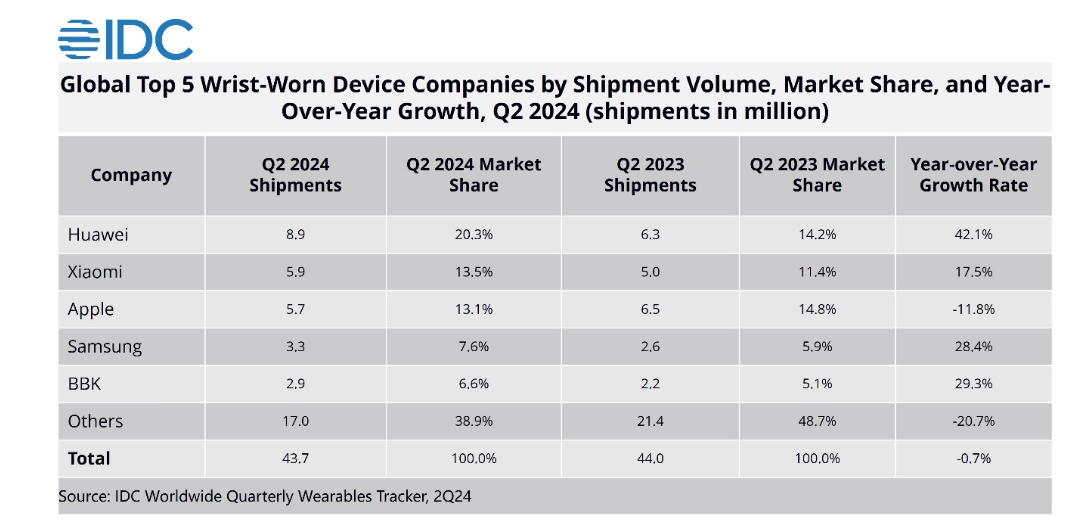 По оценке исследовательской компании IDC, глобальные продажи наручных устройств во втором квартале текущего года показали небольшое снижение на 0,7%. Всего было продано 43,7 млн наручных устройств, 15,5 млн продаж было обеспечено продажами в Китае. Рынок Китая вырос в этом сегменте на 10,9% по сравнению с результатами аналогичного периода годом ранее. В общем объёме продаж 34,7 млн обеспечили продажи умных часов и 9 млн устройств принёс рынок браслетов. Умных часов в Китае было продано на 18,7% больше в сравнении с этим периодом годом ранее, а браслетов, наоборот, было продано на 4,8% меньше.
