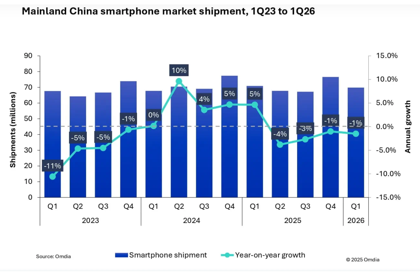 Согласно последнему отчету аналитической компании Omdia, рынок смартфонов материкового Китая в первом квартале 2026 года показал снижение на 1 % в годовом исчислении. Общий объем поставок составил 69,8 млн единиц. Основным фактором отрицательной динамики стало увеличение стоимости компонентов, особенно модулей памяти. Это вынудило многих производителей пересмотреть ценовую политику, что отразилось на покупательской активности. Лидером рынка стала компания Huawei, отгрузившая 13,9 млн устройств и занявшая 20 % рынка. Второе место удерживает Apple с результатом 13,1 млн единиц, а замыкает тройку лидеров OPPO, которая после воссоединения с брендом realme поставила 11 млн смартфонов.