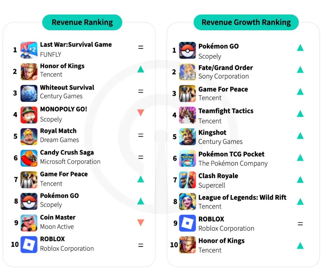 Высокие доходы Last War: Survival Game обеспечили внутриигровые события в конце сезона, скидки и соревновательные режимы, такие как «Прорыв линии фронта». Honor of Kings значительно поднялась в рейтинге благодаря нескольким крупным коллаборациям, включая сотрудничество с популярными китайскими франшизами, что привлекло множество игроков.