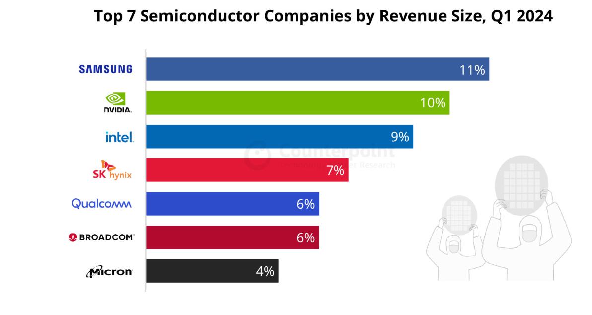 Исследовательская компания Counterpoint представила интересную инфографику по результатам работы в первом квартале текущего года отрасли полупроводников. Лидером по объёму производства полупроводников стала компания Samsung, во многом это оказалось возможным благодаря спросу на память DDR5 и хранилища данных для работы с задачами искусственного интеллекта. Второе место по объёму производства полупроводников у компании Nvidia, её результаты показали 19% рост относительно данных четвёртого квартала прошлого года. При этом отмечается, что у другого многолетнего лидера отрасли, компании Intel, наблюдалось снижение выручки на 14%. В пятёрке лидеров рынка также находятся компании SK Hynix и Qualcomm. Среди контрактных производителей полупроводников лидером выступает компания TSMC, которая продемонстрировала положительную динамику, даже превзойдя прогнозы аналитиков. Компания TSMC ожидает, что ее доходы в сегменте производства чипов для работы с искусственным интеллектом вырастут в этом году на 50%. В первой тройке контрактных производителей находятся также компании Samsung и SMIC.