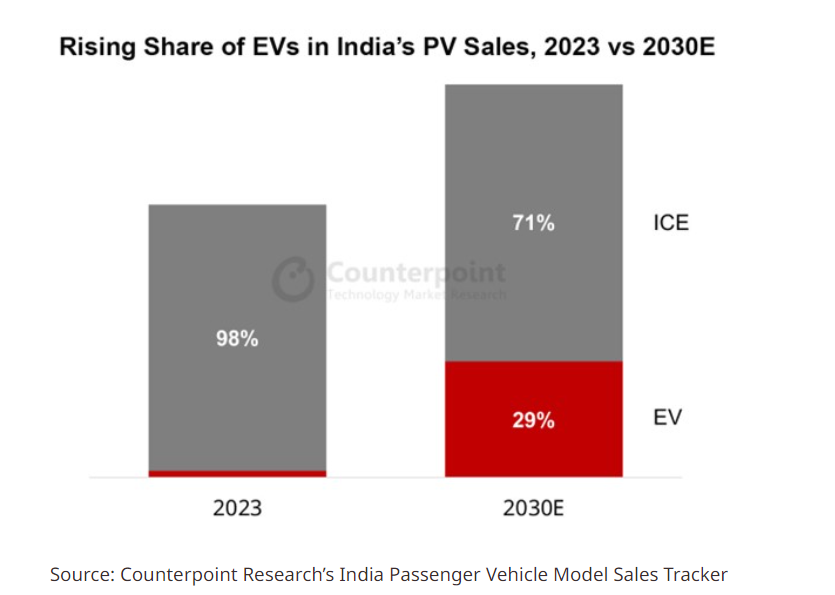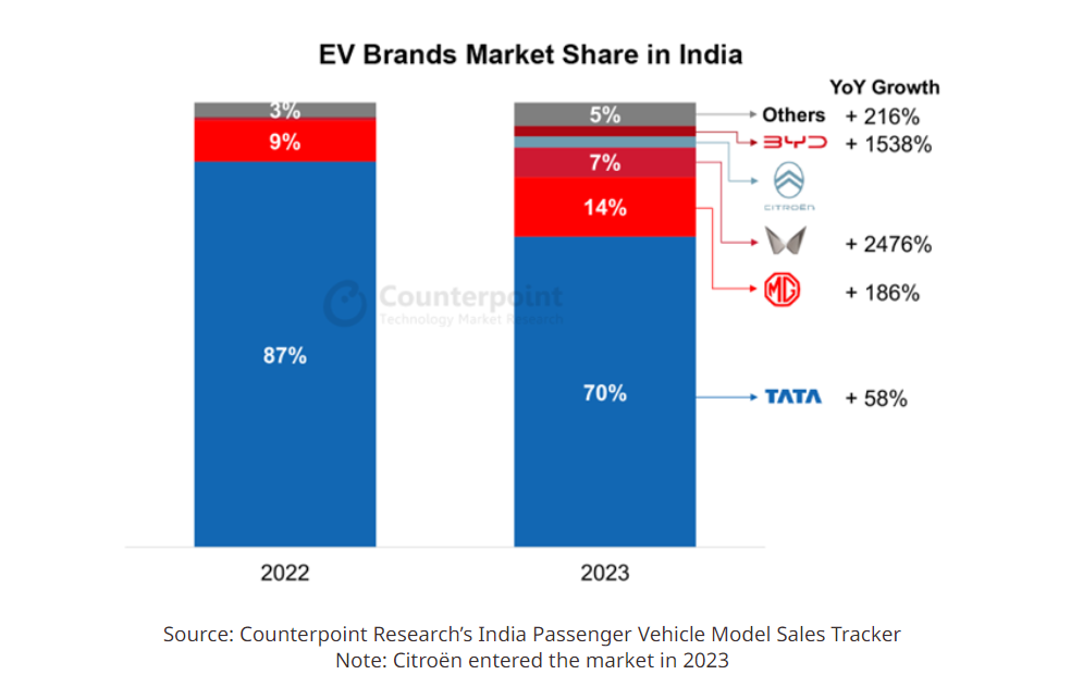 Рынок электромобилей в Индии вырос в прошедшем году почти в два раза. Этому способствовали правительственные инициативы, направленные на развитие инфраструктуры и поддержку продвижения электрического транспорта. На текущий год эксперты исследовательской компании Counterpoint прогнозируют рост продаж электромобилей в Индии на 66%, однако доля продаж электрокаров составляет не более 4% от общего объёма продаж новых автомобилей. Тем не менее темпы развития этого сегмента будут активно расти, и, как ожидается, к 2030 году объём продаж электромобилей в Индии достигнет 30% от общего объёма продаж новых машин. Количество компаний, занимающихся производством электрокаров в Индии, будет расти, на этот рынок могут выйти компании Tesla и вьетнамский производитель VinFast, что сделает рынок более конкурентным и привлекательным для покупателей.