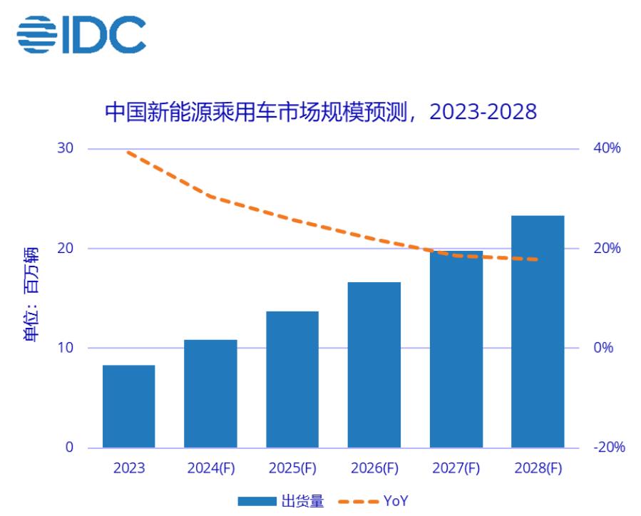 По оценке исследовательской компании IDC, рынок легковых автомобилей на новых источниках энергии, к которым относят чисто электрические машины и машины с подключаемыми гибридными установками, достигнет в Китае 20 млн единиц к 2028 году. На этом отрезке времени среднегодовой темп прироста будет составлять 22.8%. Отмечается, что развитие автомобильного транспорта на новых источниках энергии вступило в стадию устойчивого развития, доля машин на новой энергии в первом квартале текущего года в Китае продолжила рост. Наилучшие результаты показывают машины в стоимостном диапазоне от 100 тысяч юаней до 300 тысяч юаней (от 14 000$ до 41 000$). По данным за май производство машин на новой энергии достигло 881 тысячи единиц, что превысило показатели мая прошлого года на 31%, при этом рост относительно апрельских результатов составил 13.8%. Подчеркивается, что 94 тысячи таких машин было поставлено на экспорт. Уровень проникновения автомобилей на новых источниках энергии по результатам мая составил 47%.