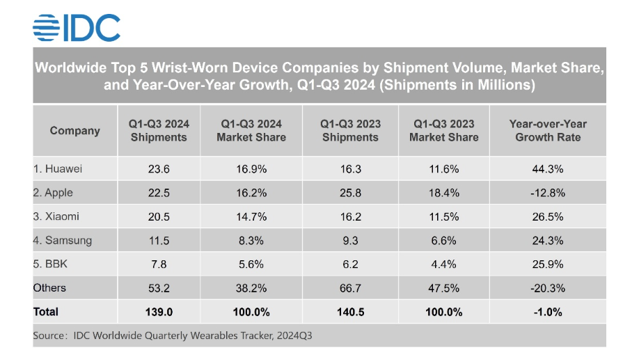Лидером рынка наручных устройств по итогам трёх кварталов является компания Huawei с отгрузками в объёме 23,6 млн устройств. Следом идёт компания Apple с отгрузками 22,5 млн устройств, а замыкает тройку лидеров компания Xiaomi с отгрузками 20,5 млн устройств. В пятёрке лидирующих компаний также находятся компании Samsung и BBK с результатами 11,5 млн и 7,8 млн устройств соответственно.
