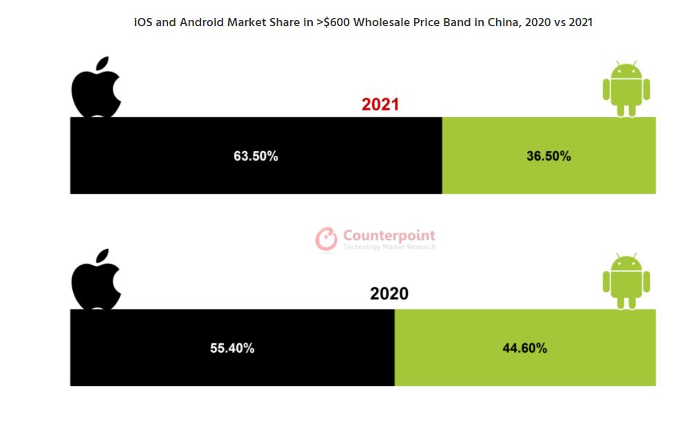 Китайские производители смартфонов прилагают значительные усилия, чтобы увеличить долю продаж моделей высокого ценового диапазона, но на текущий момент это у них не получается. Так, в 2021 году доля продаж в Китае моделей смартфонов на операционной системе Android в ценовом диапазоне более 600$ снизилась до 36.5% с 44.6%, которую она составляла в 2020 году. Это демонстрирует, что китайским производителям пока не удаётся захватить долю дорогих моделей, которую ранее освободила компания Huawei. При этом китайские производители смартфонов прилагают значительные усилия для продвижения своих топовых смартфонов. Например, они готовы держать не одну, а две линейки флагманских моделей, как, например, Honor Magic V и Honor Magic 4. Эксперты выделяют несколько особенностей, которые являются необходимыми атрибутами флагманских моделей — это экраны, изготовленные по технологии LTPO, вспомогательные камеры с высоким разрешением, способные работать совместно с основной камерой, и дополнительные игровые возможности, например, системы охлаждения. Опыт Huawei демонстрирует, что добиться устойчивого признания в сегменте дорогих моделей можно благодаря добавлению собственных особенностей, например, повышению качества фотовозможностей.