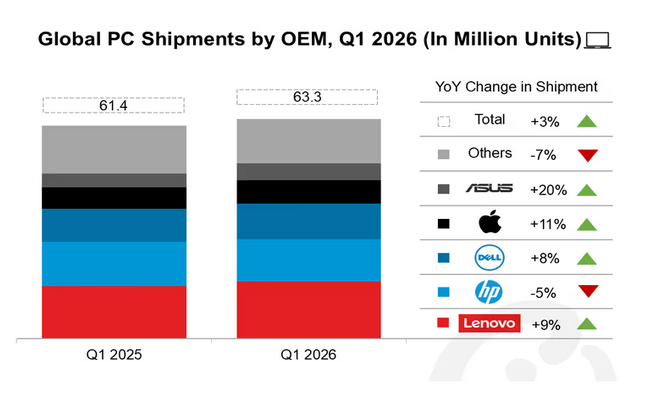 ​Лидером рынка остается Lenovo, чьи показатели достигли 16.5 млн штук, что соответствует доле в 26%. Заметное увеличение объемов продемонстрировали также Dell и Apple. Последняя отгрузила 6.7 млн устройств, чему способствовал старт продаж линейки MacBook в марте. Наиболее выраженную динамику показала компания Asus, увеличившая поставки на 20% до 4.8 млн единиц благодаря интересу покупателей к потребительским ноутбукам. В то же время у HP зафиксировано снижение на 5%, хотя компания сохраняет за собой вторую строчку в общем рейтинге.