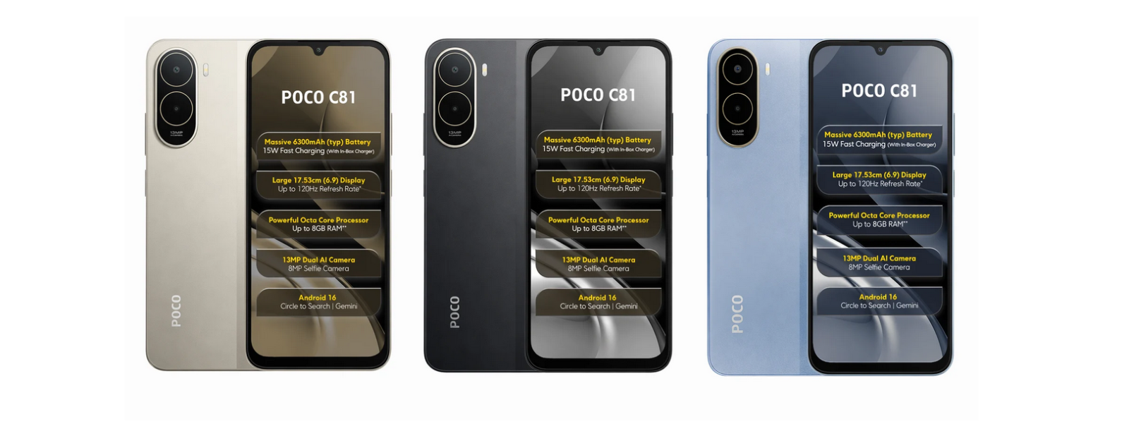 Внутри моделей установлен восьмиядерный процессор Unisoc T7250, работающий вместе с оперативной памятью стандарта LPDDR4X и накопителем UFS 2.2. Пользователи могут расширить объем хранилища с помощью карты microSD до 2 ТБ. Старшая модель Poco C81 поставляется с актуальной операционной системой Android 16 и оболочкой HyperOS 3, тогда как версия C81x работает на базе Android 15. Корпуса обеих моделей защищены от брызг по стандарту IP52 и оборудованы сканером отпечатков пальцев на боковой грани.