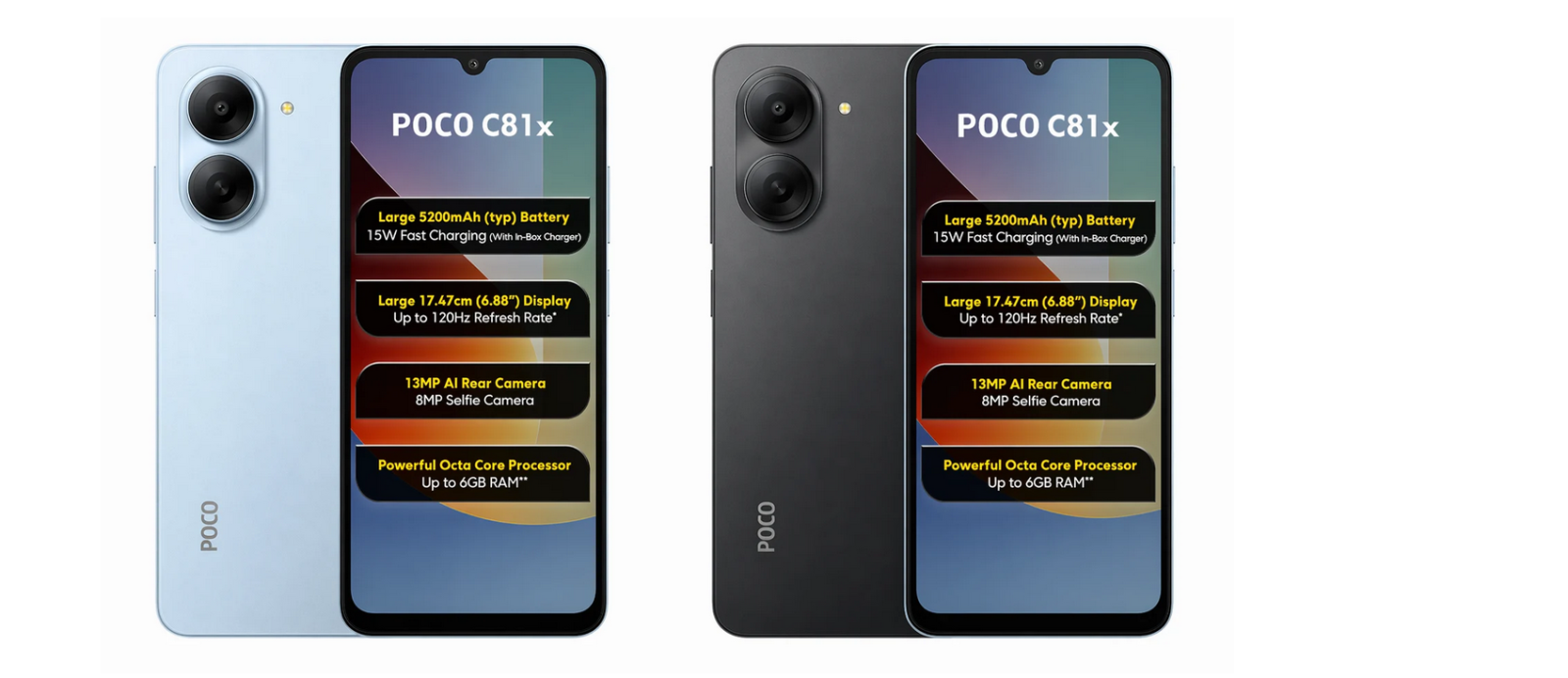 Система камер идентична для обоих смартфонов: основной модуль на 13 МП и фронтальный на 8 МП. Программное обеспечение поддерживает ночной режим, HDR и сканирование документов. Отличия кроются в емкости аккумуляторов. Новинка Poco C81 снабжена батареей на 6 300 мАч, а младшая версия C81x получила элемент емкостью 5 200 мАч. Оба устройства поддерживают зарядку мощностью 15 Вт и функцию обратной зарядки для питания других аксессуаров.