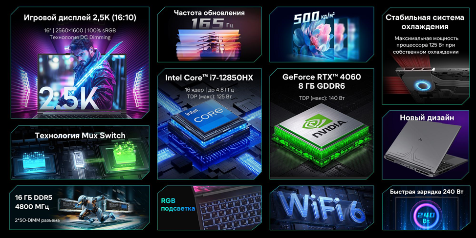 Компания MAIBENBEN запустила в России игровой ноутбук X16D. Он оснащен процессором Intel Core i7-12850HX, видеокартой NVIDIA GeForce RTX 4060 и 16-дюймовым QHD-дисплеем с разрешением QHD+ (2560×1600), частотой обновления 165 Гц и яркостью 500 нит. Новинка поддерживает MUX Switch, двухканальную память DDR5 (в базе 16 ГБ) и накопитель PCIe 4.0 SSD (в базе 1 ТБ). Корпус ноутбука выполнен из алюминия и пластика, вес — 2,3 кг. Система охлаждения состоит из двух вентиляторов и тепловых трубок. Большинство основных разъёмов, включая HDMI 2.1, Mini DisplayPort 1.4a, RJ45 Ethernet и USB-C 3.2 Gen2, размещены на задней панели. Справа расположены два порта USB-A 3.2 Gen1. Слева – один порт USB-A 3.2 Gen1, комбинированный аудиоразъём 3,5 мм и USB-C 3.2 Gen1 для дополнительных устройств. Цена новинки в России стартует от 128 990 рублей.