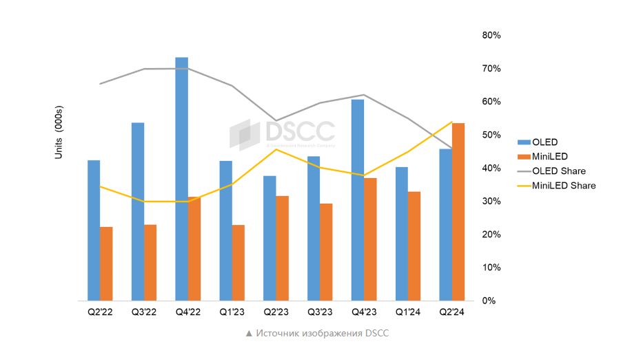 По данным исследовательской компании DSCC, в прошедшем квартале впервые зафиксирована ситуация, когда телевизоры с панелями Mini LED опередили телевизоры с панелями OLED в сегменте моделей высокого класса. Общий объем поставок телевизоров высокого класса во втором квартале текущего года вырос на 44% по сравнению с аналогичным периодом годом ранее. Объем доходов от продаж в этом сегменте вырос на 28%. Отмечается, что поставки телевизоров с экранами Mini LED увеличились на 68%, а выручка от их продаж выросла на 60%, в то время как поставки телевизоров с экранами OLED выросли только на 21%, а доходы от их продаж — всего на 5%. Таким образом, впервые телевизоры с экранами Mini LED превзошли по объему продаж OLED-модели и заняли 54% от общего объема продаж в сегменте моделей высокого уровня. Среди лидеров по объему продаж в этом сегменте идут компании Samsung, Hisense, LG, TCL и Xiaomi.