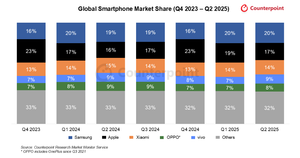 Apple заняла второе место с долей 17%, показав самый высокий рост среди пятёрки лидеров — 11%. Этому способствовали высокий спрос на iPhone 16, а также сильные продажи в Индии и Японии. Xiaomi осталась на третьем месте с долей 14%, при этом рост компании был незначительным.