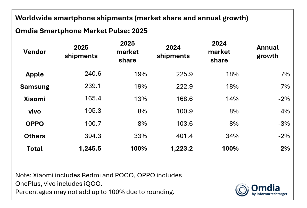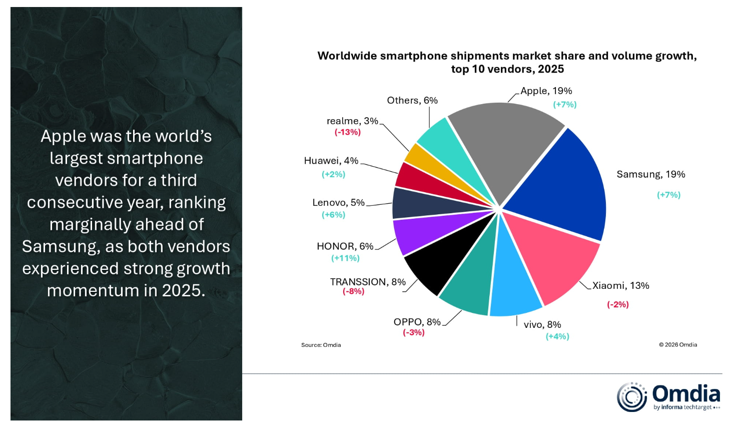 Аналитическое агентство Omdia опубликовало отчет о состоянии рынка смартфонов за 2025 год. Согласно исследованию, в прошедшем году объем мировых поставок увеличился на 2% и достиг 1,25 млрд единиц, что стало самым высоким показателем за последние четыре года. Положительная динамика наблюдалась почти во всех регионах, за исключением Китая, где спрос немного снизился после завершения программы государственных субсидий.