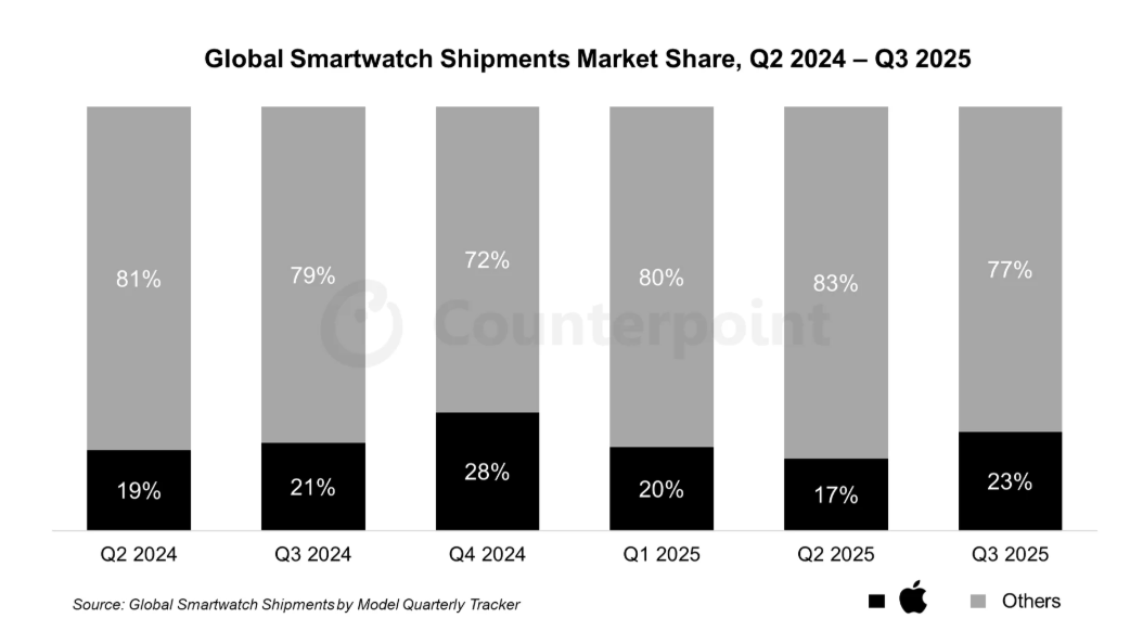 Мировой рынок умных часов продемонстрировал положительную динамику в третьем квартале 2025 года — поставки увеличились на 9% по сравнению с прошлым годом. Лидером сегмента вновь стала компания Apple, занявшая 23% рынка. На второй позиции расположилась Huawei с долей 17%. Примечательно, что Apple удалось восстановить показатели роста после снижения, которое длилось семь кварталов подряд, и вернуть себе первое место, отданное Huawei в начале года.